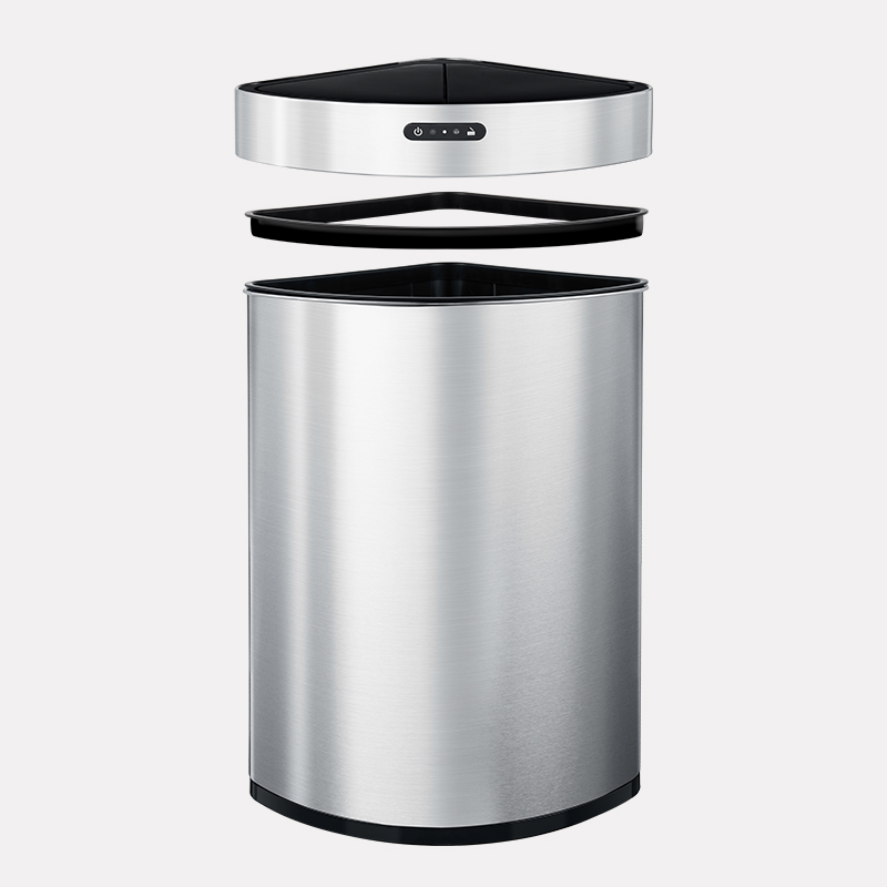 This corner sensor bin is designed for corner placement, snugly fitting wall corners to save nearly 20% space. With a double-flip lid and minimalist black/white/silver options, it fits various home and office styles. Made of stainless steel with a fingerprint-resistant coating, it’s easy to clean and durable, available in 30L and 42L. Core components ensure performance: stainless steel + ABS material (rust and wear resistant); double-flip lid with sensor/manual opening, three-level adjustable sensor distance to avoid false triggers; optional ozone deodorization module and silent casters for customization. Certified by CE, RoHS and ISO9001, it meets quality standards. Suitable for corners in multiple scenarios: living room (blends with decor, double-flip lid blocks odors); kitchen (optional deodorization, oil-resistant stainless steel); office (large capacity for multi-person use, hygienic sensor opening, optimized layout).