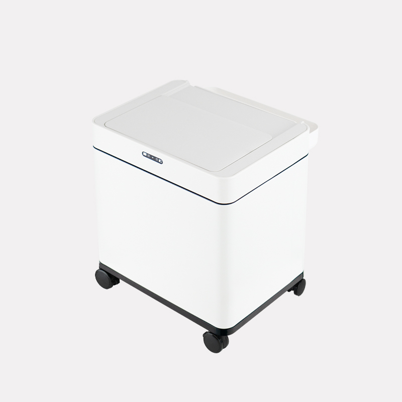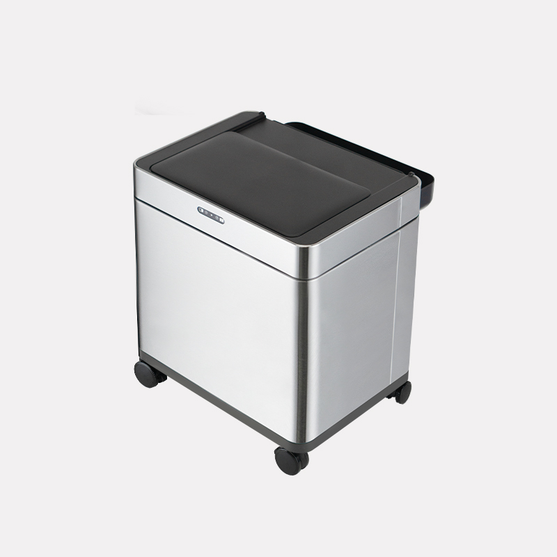 The HN-ZT sensor bin, made of stainless steel and ABS, features a built-in ozone generator, sliding & silent opening, and an optional foot stand, ideal for under-desk placement in offices.