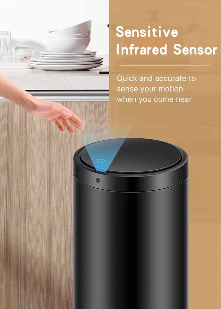 The cylindrical sensor bin has a round edgeless design, saving 15% space vs square models. Available in black/white/silver, it fits various styles. Stainless steel with fingerprint-resistant coating is easy to clean, offered in 30L/42L. Core components ensure performance: stainless steel+ABS (rust-resistant); rotating lid with sensor/manual/vibration modes, adjustable sensor distance, optional deodorizer. Suitable for home/office: living room (versatile, hygienic sensor opening); kitchen (optional deodorization, oil-resistant); office (large capacity for multi-person use).